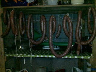 Da var korvproduksjonen ferdig, gikk egentlig ganske så greit. Med 7 meter innkjøpt grisetarm ble det laget både muflon og hjortepølser. Muflon (3 kg kjøtt, 800g spekk 280 g salt, pepper, muskat og viltkrydder), Hjort og villsvin (1,3 kg kjøtt, 400g spekk, 100g salt, muskat og cheyennepepper). Nå henger dem forran vifte i kjeller og det satses på at dem er ganske så klare rundt midten av april. Litt lite tarm, derfor ble det også fikset noen tildels meget salte kjøttboller!