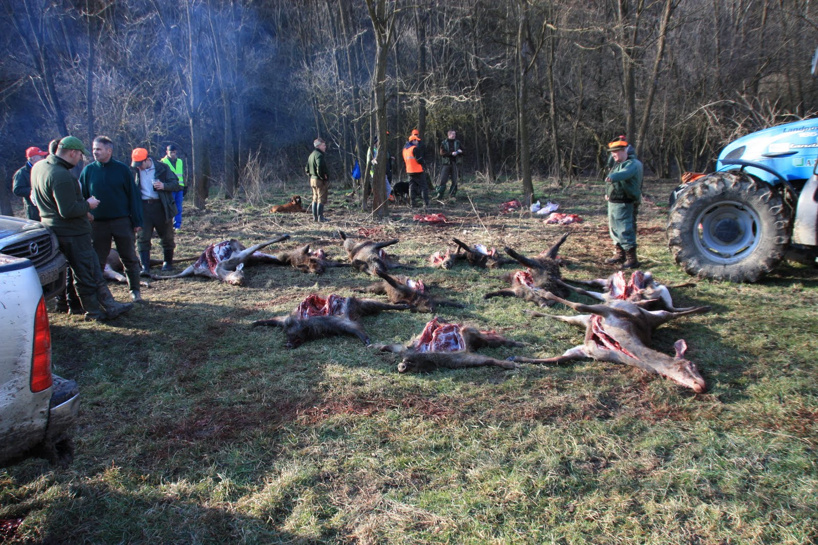 Andre drev denne dagen så jeg ingenting, også her meget få skudd maks 10. Har en video, får se om jeg får lagt den opp senere. Noen hadde bra pass og det ble noen griser og hjorter på paraden. Kort drev og vi avsluttet kl 14!!!! Det ble deretter viltparade med hornblåsning (første gang det ble blåst i horn – trodde de skulle blåse igang og avslutte drevene). 25 dyr på paraden, men som tidlige sagt var det kun 14 som vi 18 fra Norden hadde skudd. Vi hadde skutt 52 skudd. Et særdeles dårlig resultat og stemningen bar preg av dette.