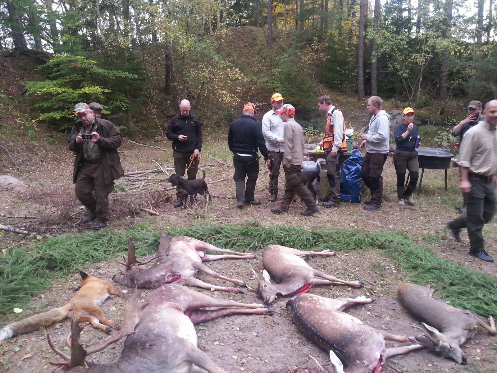 Det er 11 dyr som ligger, og et pågående ettersøk på en påskutt hind. En rev, to skovler, fire spetser, en dovkalver, en råbukk og to rådyrgeiter. På tolv skyttere er det en fin dag.