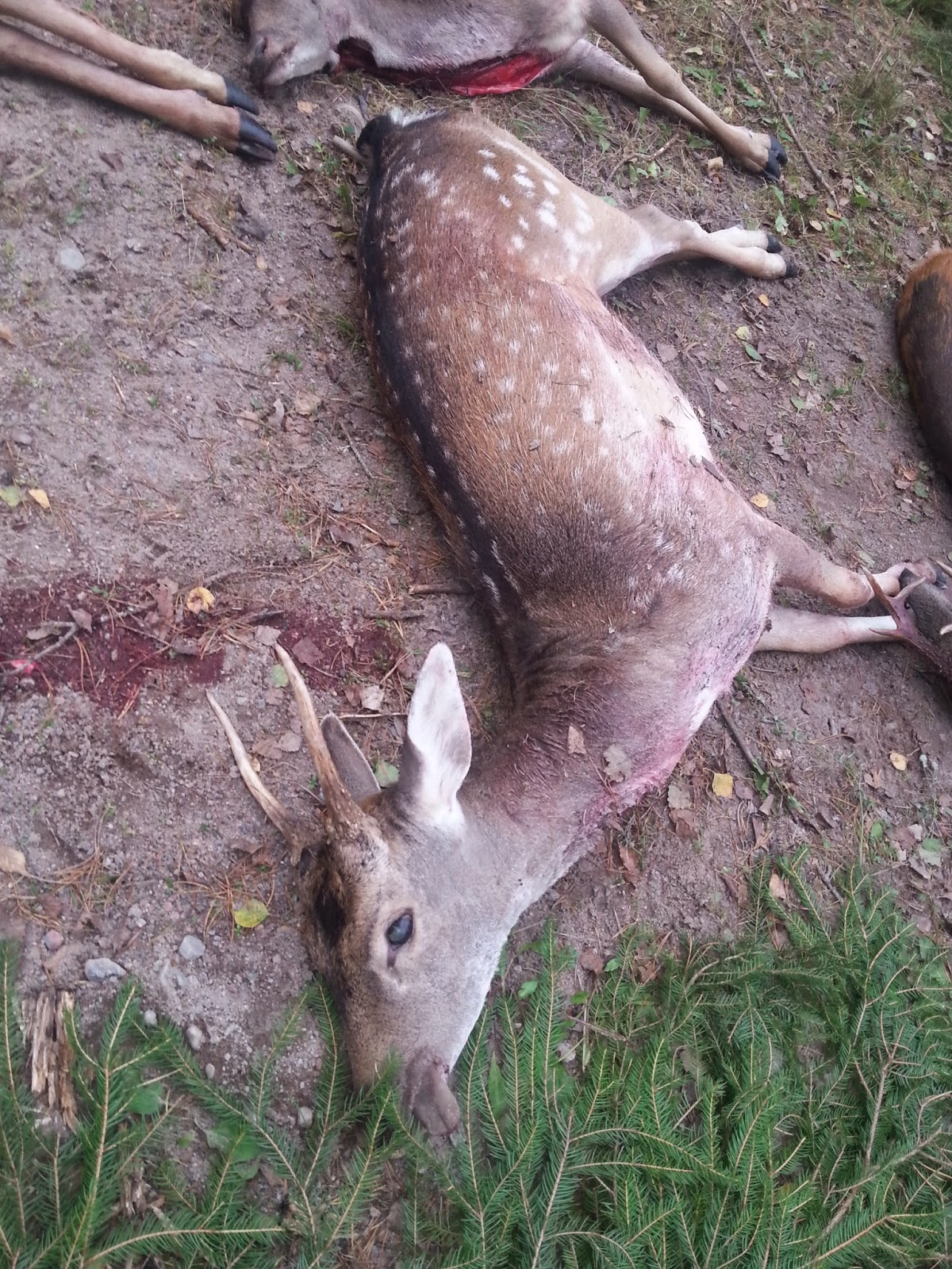 Når drevet er igang tar det maks 5 minutter før tre hunder driver. Og ikke mange minutter etter hører jeg det kommer en gjeng….. Spenningen er på topp men ser dessverre bare bein og korte glimt av dov gjennom skogen, sikkert 15-20 stykker. Drevet fortsetter og snart ser jeg det kommer en ensom dov på stien mot mitt pass. Stopper bak noe trær og jeg kunne skutt men venter den ut. Den tar litt for mange steg og jeg må derfor flytte litt, den merker det og tar noen steg til. Heldigvis ikke mange nok, og PANG! Den tegner bra synes jeg, men forsvinner bakom en stein. Melder på radion at jeg tror den ligger.