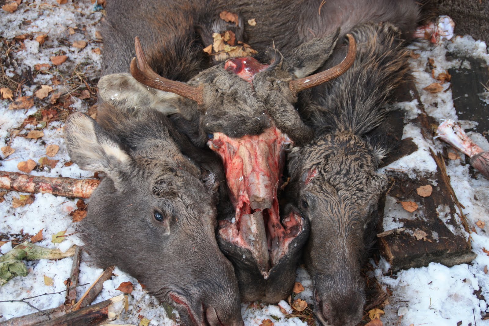 Lørdagen var stille inntil midt i andre drevet for dagen, da reiste Pluto iveg såpass langt at Jaktboss var sikker på elgkontakt. GPS’en avslørte retningen og etter få minutter smalt det. Emil hadde skutt på en kalv, og etter en liten gåtur frem til skuddplassen ble det snart rapportert om at den lå nede. Da ble det slakting: