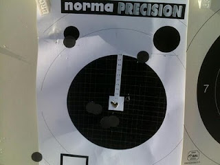 Ny tur til skytebanen med Vixen idag, etter betydelig pussing av löpskanalen. Etter litt tull i starten fant jeg endelig en super skytestilling. Skrudde litt ned fra forrige gang , samt noen knepp mot höyre. Sluttet skytingen med to serier av tre skudd i hver av skivene og resultatet: