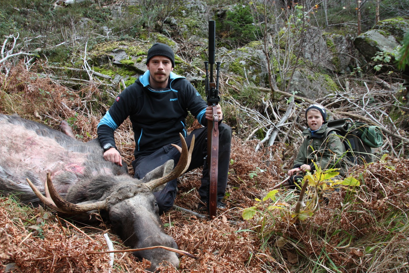 På fallet er det voksenopplæring av skytter som får ut av elgen uten annet enn verbal guiding. Mr Bagderboy hadde lite bruk for tofoten ved skyting av elg, var tre bra skudd og det hadde holdt med ett. Men ok at det skytes til elgen ligger. Bilde av den stolte skytter, med elgen etter vi har dratt den en bit – ryggen er derfor nybarbert. Tilskuer er lille mr snublefot, som gjorde en bra innsats som bærer.
