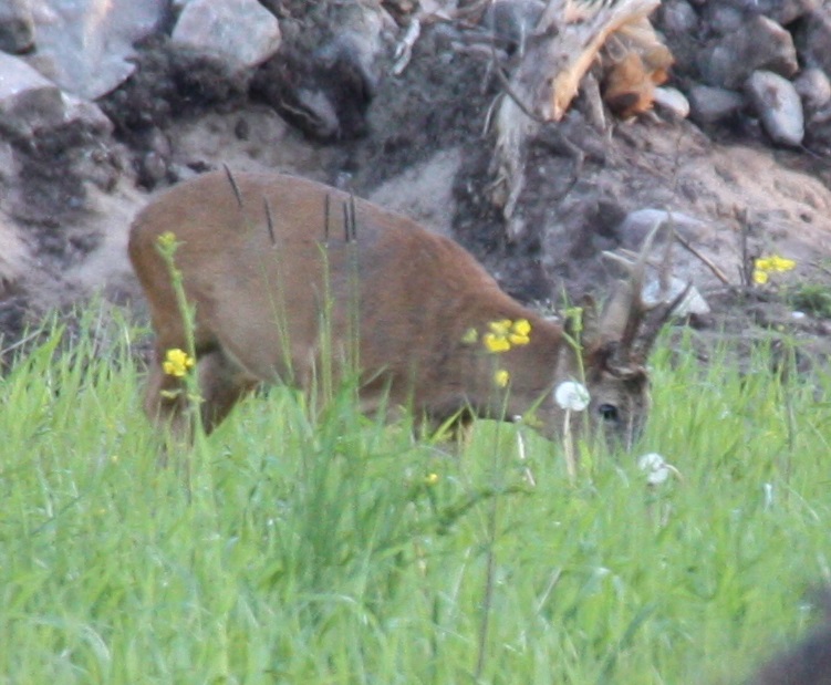 Kl 05 bestemte jeg meg derfor for å dra mot bilen, og da forbi annen viltåker. Gikk sakte og tittet forsiktig opp og der sto han. Bukken som jeg også fikk beskue grundig i fjor, og iår klart utenfor det man kan kalle liten bukk. Klar medalje etter mitt skjønn, største jeg har sett i det ville noen gang (større en denne jeg fikk på kamera også) og på størrelse med dyrepark-rådyr jeg har sett. Men hvilken valør på medaljen.????