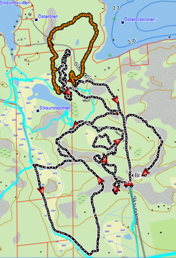 Förste svingen var altså på 35 min og med snittfart på 9,5 (god gammel Albinfart). Om han byttet dyr eller ei er vanskelig å si, total lostid også. Når stoppet det?? Men minst 1,45 (snitt 6,3) og kanskje 2,15 (snitt 5,8). Totalt 16 km.