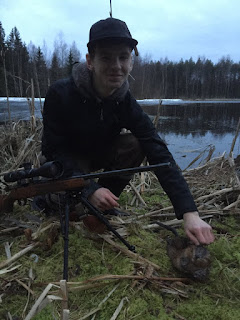 Vente vente PANG!! Ser den ligger men Seb tar kjapt ladegrep som vi snakket om. En meget nøyd skytt. Vi forsøker fiskestang men gir opp og henter kano. Fangsten blir berget, men prisen for skinnet blir lav. Veldig utgangshull med Sako blyspiss 3,6 gr. Perfekt skuddplassering.