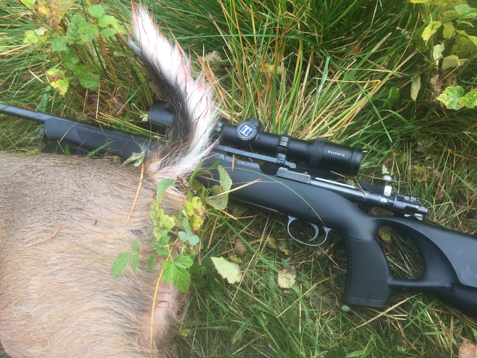 Kalven ligger sprellende i grøfta og jeg rapporterer om vellykket resultat. Tar tak i beina og skal løfte det på veien når det spreller veldig og jeg stikker det derfor. Merkelig det er liv i med et skudd midt i halsen. Blør ut på veien. Snart livløs og folket samles. Min første vitsvans noteres i boka.